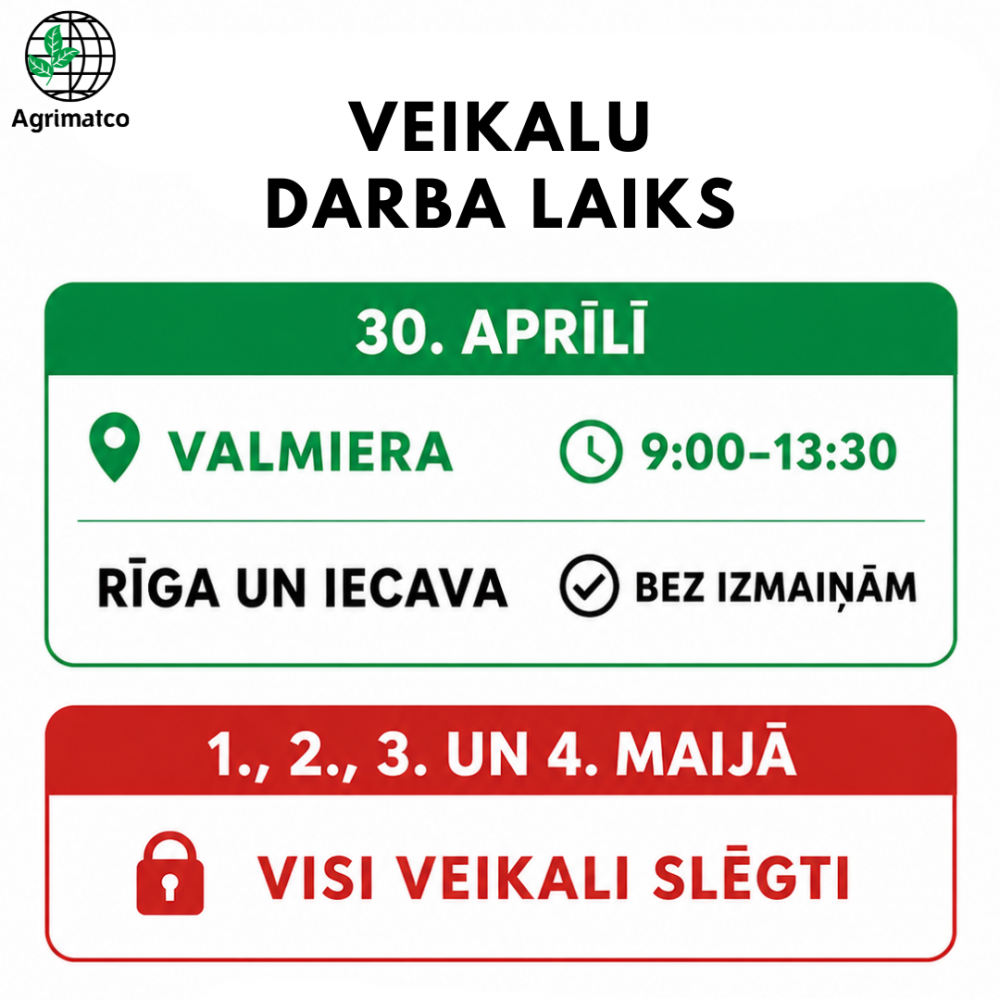 E-veikala www.agrimatco.lv pasūtījumi, kas veikti svētku dienās, tiks apstrādāti nākamajā darba dienā.