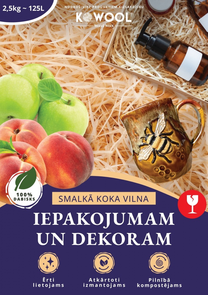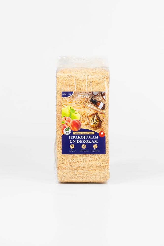 Smalkā KOWOOL koka vilna ir 100% dabīgs un drošs materiāls, kas paredzēts preču iepakošanai, aizsardzībai un dekorēšanai. Tā ir īpaši piemērota trauklu priekšmetu, dāvanu un pārtikas produktu iepakošanai, jo absorbē triecienus un palīdz uzturēt vienmērīgu mitrumu.