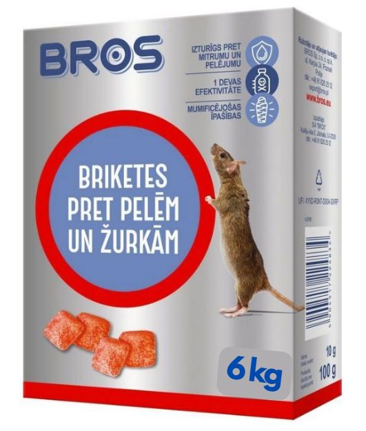 BROS briketes paredzētas peļu un žurku apkarošanai iekštelpās un ap ēkām. Tās satur īpašu ēsmu, kas ļoti piesaista grauzējus un sāk darboties jau pēc pirmās uzņemšanas. Iedarbība parādās pēc vairākām dienām, tāpēc grauzēji nesaista indi ar citu bojāeju un turpina to ēst.