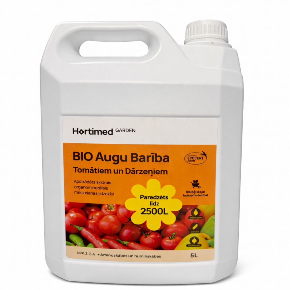 Hortimed GARDEN BIO ir dabīgs, vegānisks un bioloģiskai audzēšanai piemērots šķidrais mēslojums tomātiem un dažādiem dārzeņiem. Tas vienlaikus darbojas kā augu barība un augšanas stimulators, nodrošinot augus ar pamata barības vielām (NPK 3-2-4) un bioloģiski aktīvām vielām — humīnskābēm un aminoskābēm.