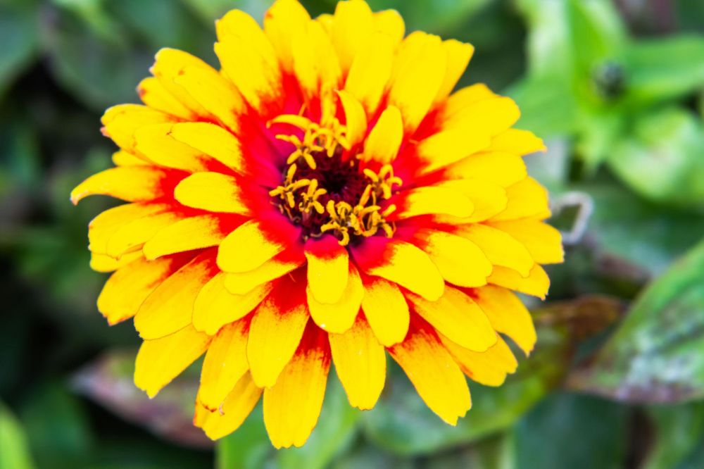 Cinnijas ‘Swizzle Scarlet & Yellow’ (Zinnia elegans) ir viengadīga vasaras puķe ar daļēji pildītiem, kontrastainiem ziediem spilgti dzeltenā krāsā ar koši sarkaniem ziedlapu galiem un dzeltenu centru. Ziedi ir dekoratīvi un bagātīgi veidojas no vasaras sākuma līdz rudens salnām.