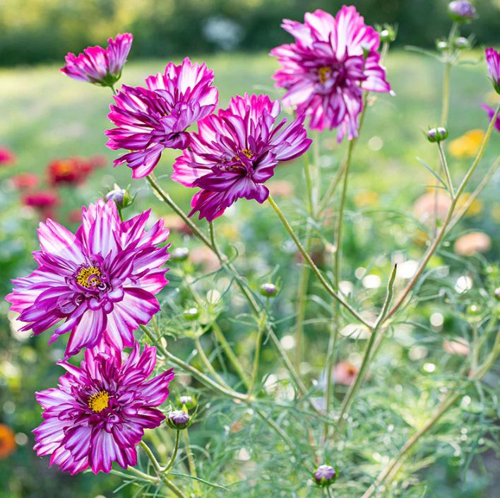 Kosmejas (Cosmos bipinnatus) ‘Double Click Bicolour Violet’ ir dekoratīva viengadīga šķirne ar pildītiem, divtoņu ziediem – baltiem ar violetiem vai purpura maliņu akcentiem. Ziedi ir bagātīgi, viegli pūkaini un atgādina nelielas peonijas, piešķirot dobēm elegantu un izteiksmīgu izskatu.