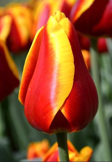 Tulpes Dow Jones ir izteiksmīga un dekoratīva tulpu šķirne ar spilgti sarkaniem ziediem un kontrastējošu dzeltenu maliņu. Šī krāsu kombinācija piešķir ziedam elegantu un pamanāmu izskatu, kas lieliski izceļas pavasara puķu dobēs.