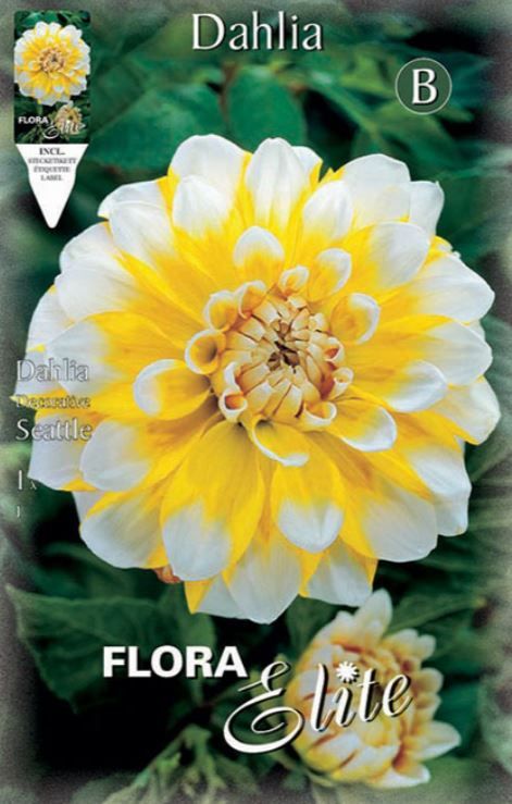 Dālija Seattle ir iespaidīga dekoratīvā šķirne ar lieliem, pilniem ziediem. Tās ziedlapas apvieno spilgti dzeltenu centru ar maigi baltām maliņām, radot izteiksmīgu un elegantu krāsu kontrastu.